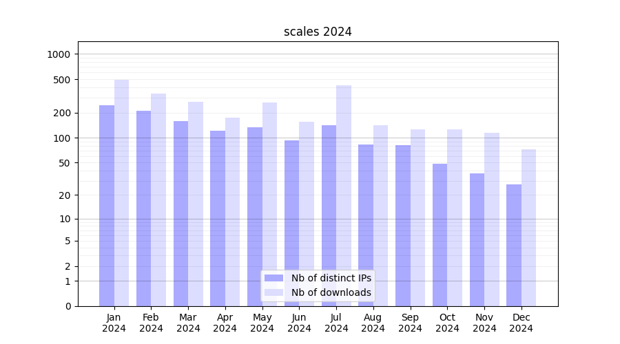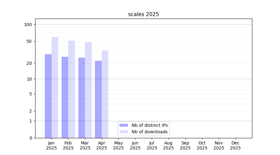 Number of downloads for software package scales, year by year, from 2025 back to 2014 (years with no downloads are omitted):