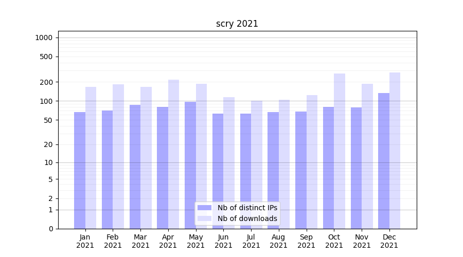 Number of downloads for software package scry, year by year, from 2025 back to 2014 (years with no downloads are omitted):