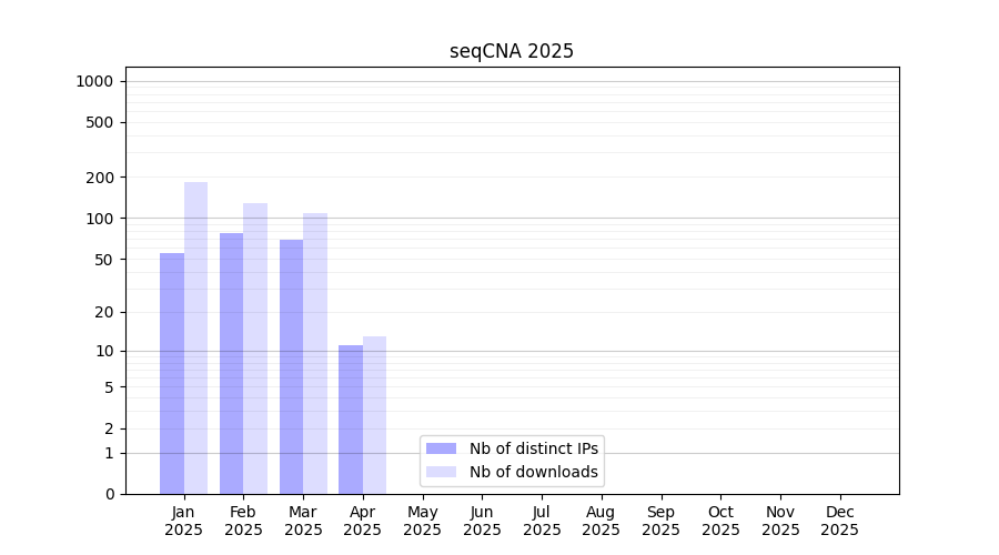 Number of downloads for software package seqCNA, year by year, from 2025 back to 2014 (years with no downloads are omitted):