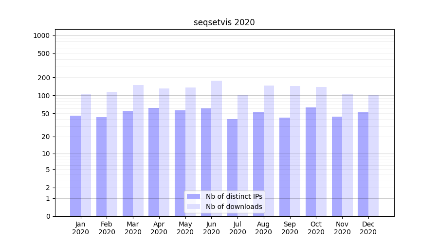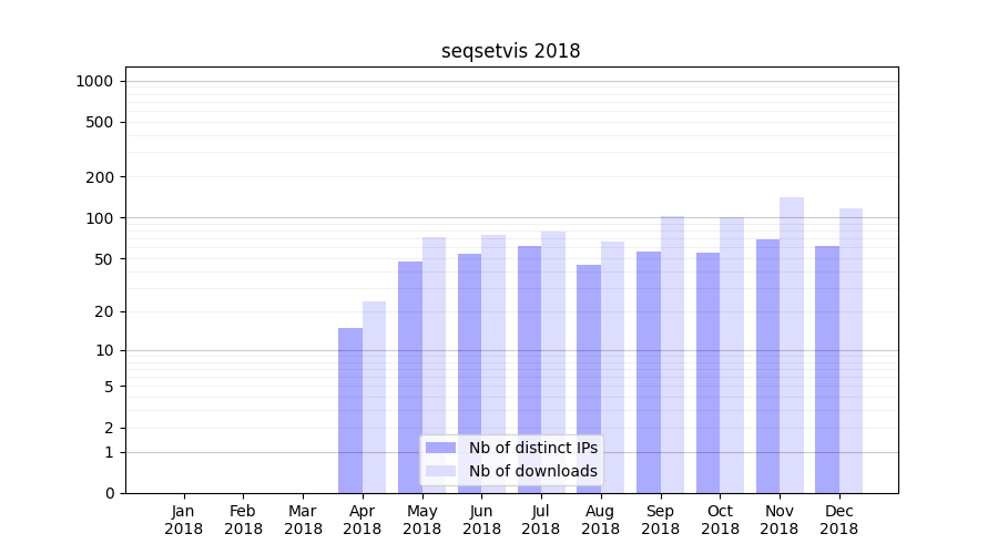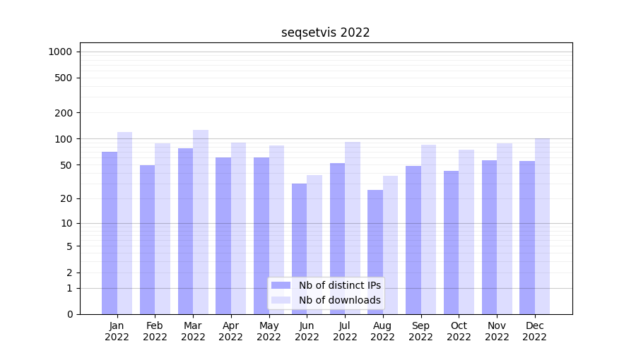 Number of downloads for software package seqsetvis, year by year, from 2025 back to 2014 (years with no downloads are omitted):