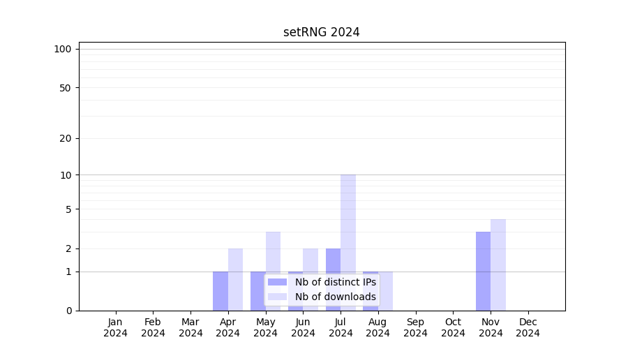 Number of downloads for software package setRNG, year by year, from 2025 back to 2014 (years with no downloads are omitted):