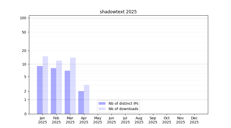 Number of downloads for software package shadowtext, year by year, from 2025 back to 2014 (years with no downloads are omitted):