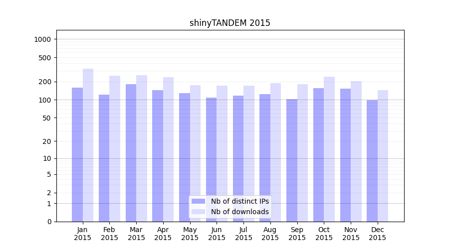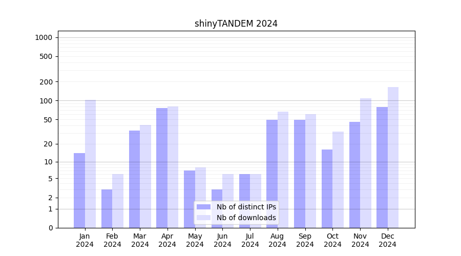Number of downloads for software package shinyTANDEM, year by year, from 2025 back to 2014 (years with no downloads are omitted):