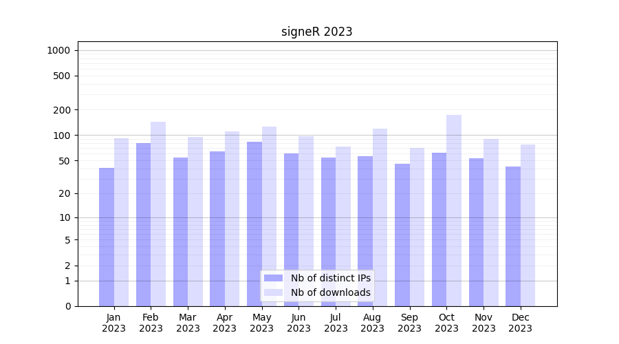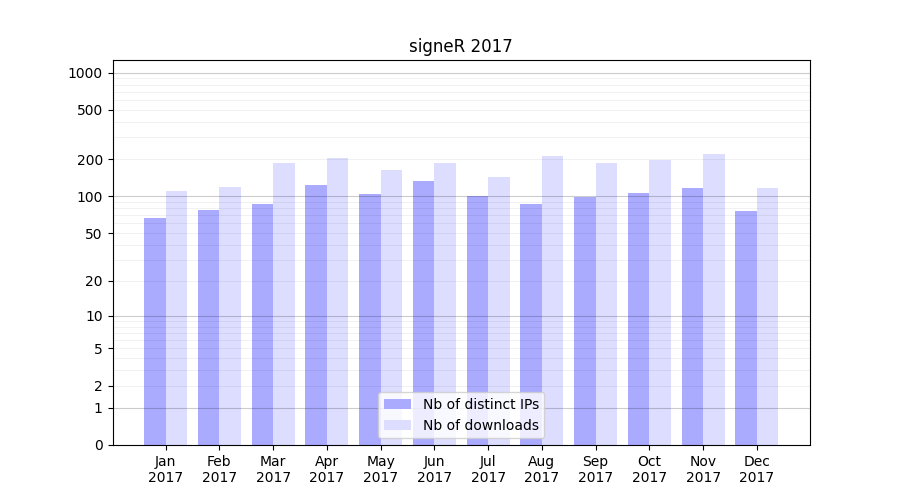 Number of downloads for software package signeR, year by year, from 2025 back to 2014 (years with no downloads are omitted):