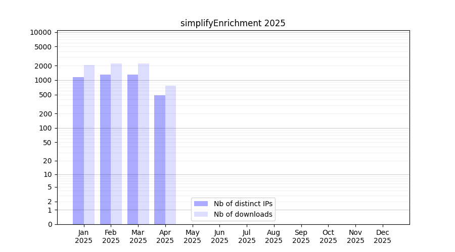Number of downloads for software package simplifyEnrichment, year by year, from 2025 back to 2014 (years with no downloads are omitted):