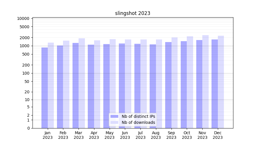 Number of downloads for software package slingshot, year by year, from 2025 back to 2014 (years with no downloads are omitted):