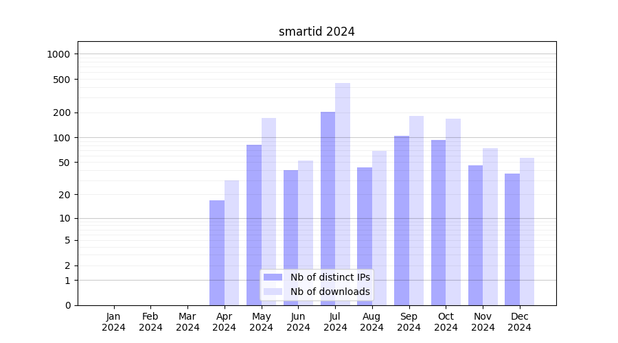 Number of downloads for software package smartid, year by year, from 2025 back to 2014 (years with no downloads are omitted):