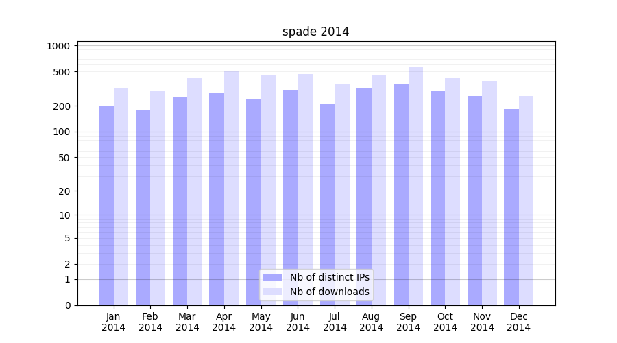 Number of downloads for software package spade, year by year, from 2025 back to 2014 (years with no downloads are omitted):