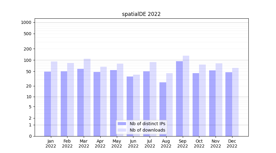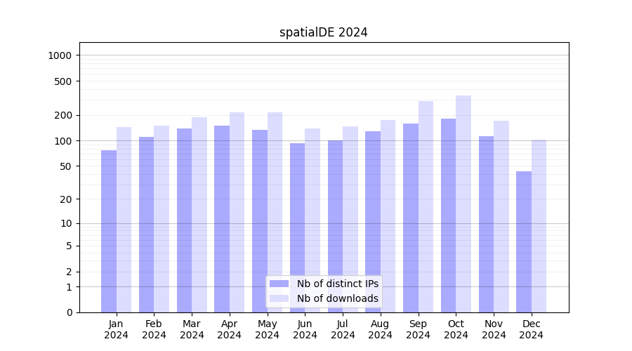 Number of downloads for software package spatialDE, year by year, from 2025 back to 2014 (years with no downloads are omitted):