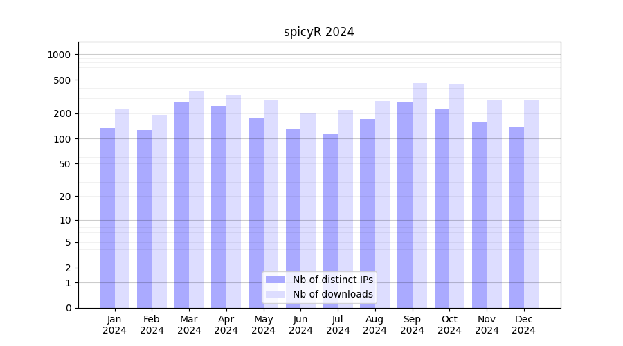 Number of downloads for software package spicyR, year by year, from 2025 back to 2014 (years with no downloads are omitted):
