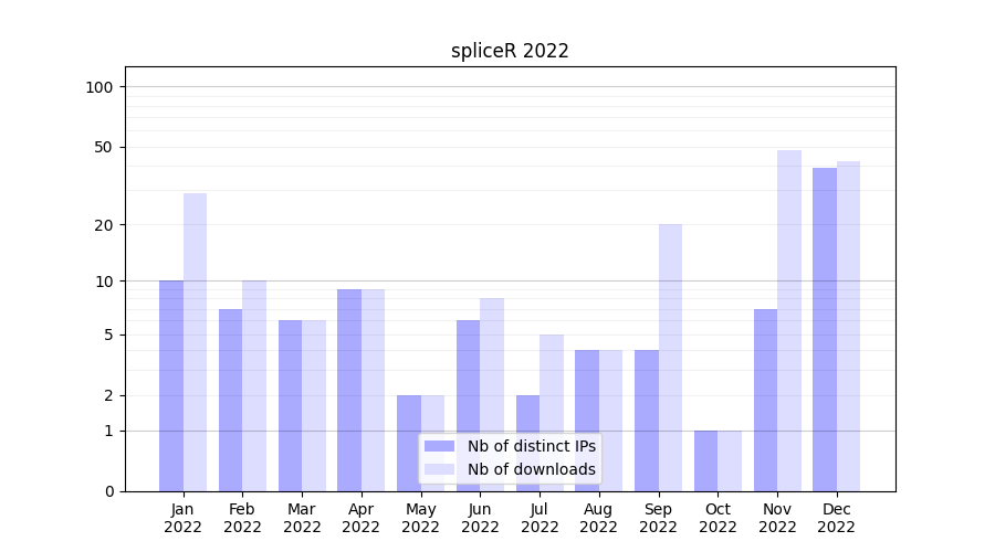 Number of downloads for software package spliceR, year by year, from 2025 back to 2014 (years with no downloads are omitted):