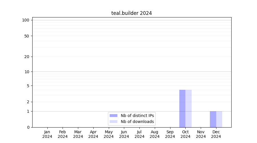 Number of downloads for software package teal.builder, year by year, from 2025 back to 2014 (years with no downloads are omitted):