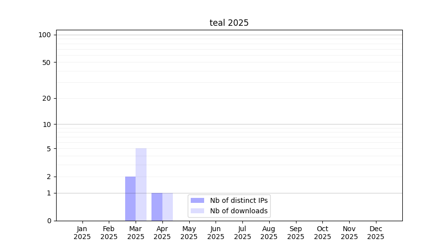 Number of downloads for software package teal, year by year, from 2025 back to 2014 (years with no downloads are omitted):