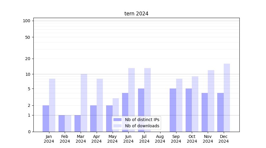 Number of downloads for software package tern, year by year, from 2025 back to 2014 (years with no downloads are omitted):