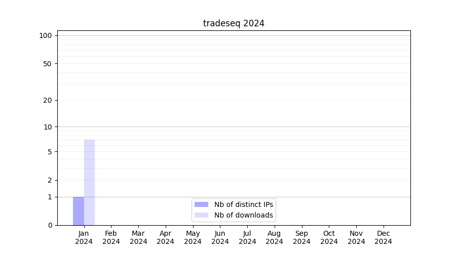 Number of downloads for software package tradeseq, year by year, from 2025 back to 2014 (years with no downloads are omitted):