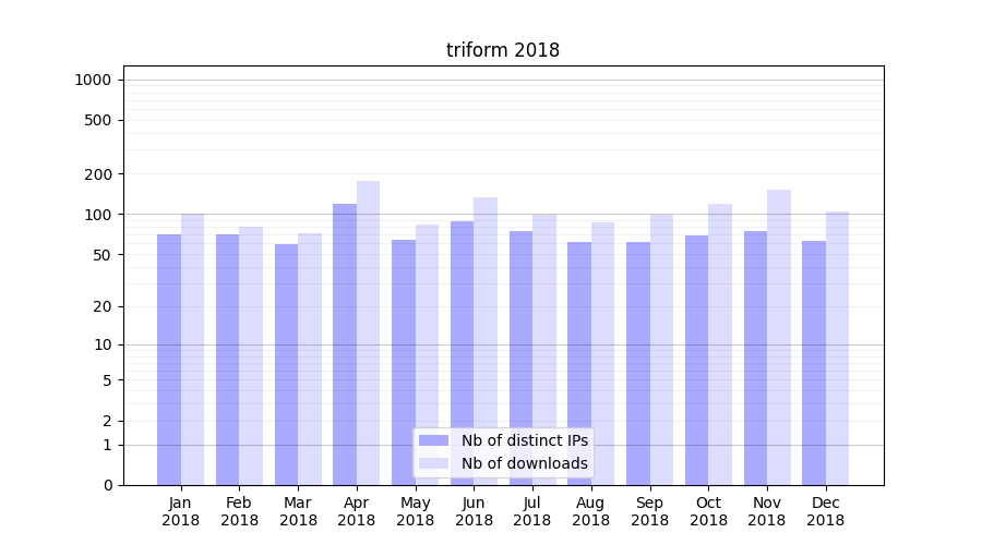 Number of downloads for software package triform, year by year, from 2025 back to 2014 (years with no downloads are omitted):