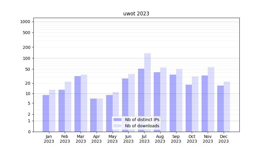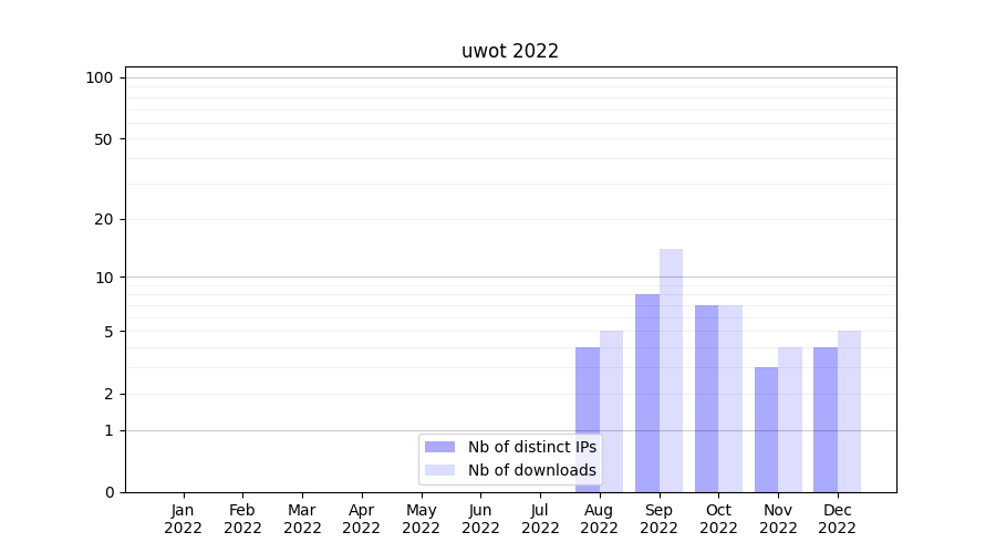 Number of downloads for software package uwot, year by year, from 2025 back to 2014 (years with no downloads are omitted):