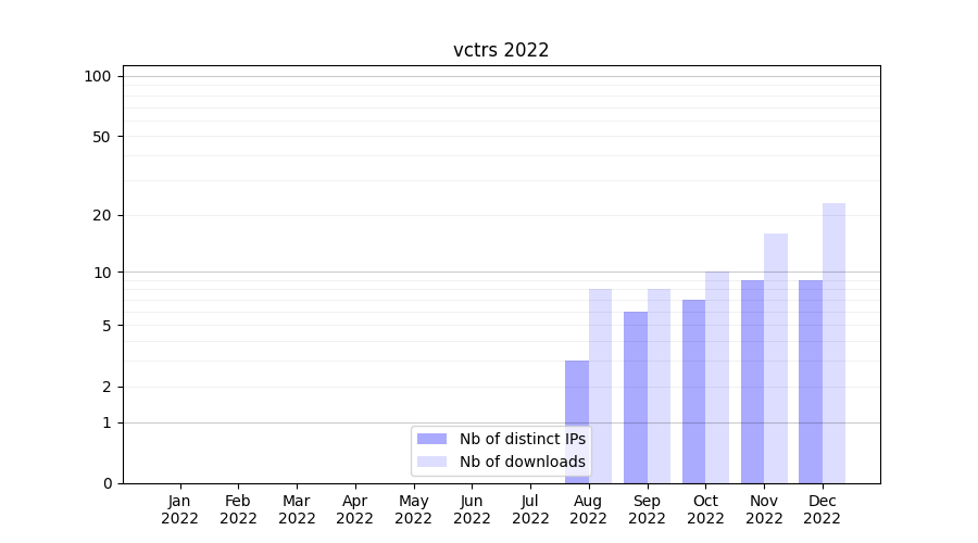 Number of downloads for software package vctrs, year by year, from 2025 back to 2014 (years with no downloads are omitted):