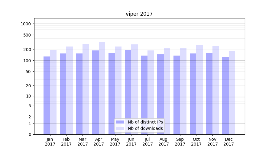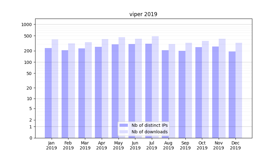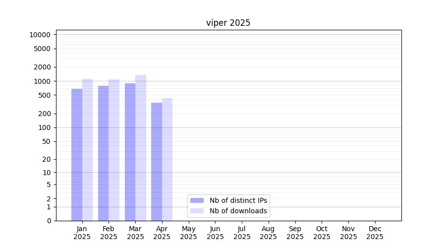 Number of downloads for software package viper, year by year, from 2025 back to 2014 (years with no downloads are omitted):