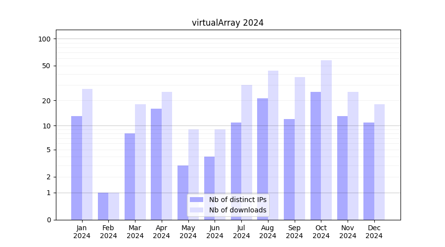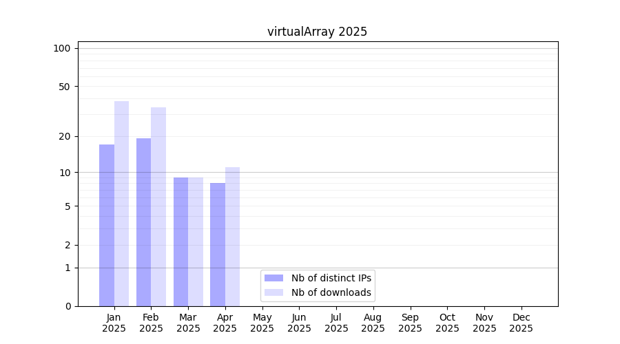 Number of downloads for software package virtualArray, year by year, from 2025 back to 2014 (years with no downloads are omitted):