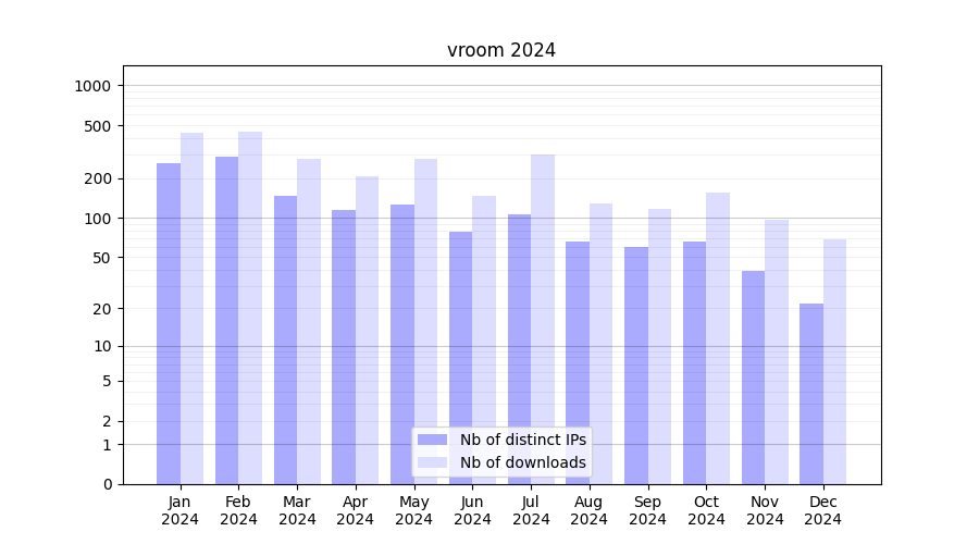 Number of downloads for software package vroom, year by year, from 2025 back to 2014 (years with no downloads are omitted):