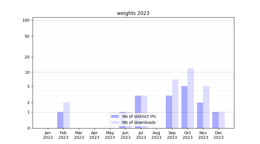Number of downloads for software package weights, year by year, from 2025 back to 2014 (years with no downloads are omitted):