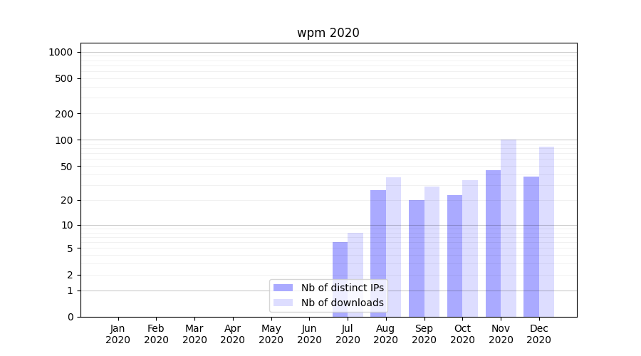 Number of downloads for software package wpm, year by year, from 2025 back to 2014 (years with no downloads are omitted):
