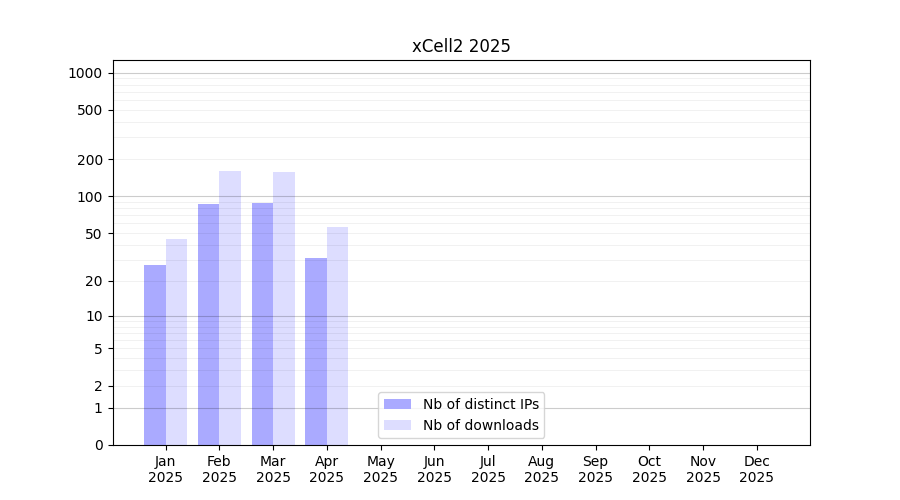 Number of downloads for software package xCell2, year by year, from 2025 back to 2014 (years with no downloads are omitted):