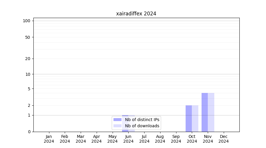 Number of downloads for software package xairadiffex, year by year, from 2025 back to 2014 (years with no downloads are omitted):