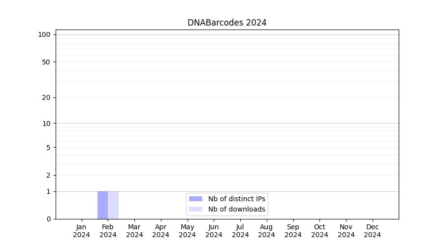 Number of downloads for annotation package DNABarcodes, year by year, from 2025 back to 2014 (years with no downloads are omitted):