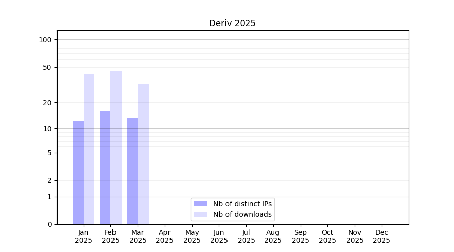 Number of downloads for annotation package Deriv, year by year, from 2025 back to 2014 (years with no downloads are omitted):