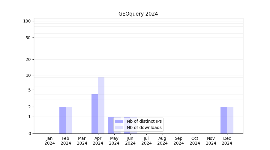 Number of downloads for annotation package GEOquery, year by year, from 2025 back to 2014 (years with no downloads are omitted):