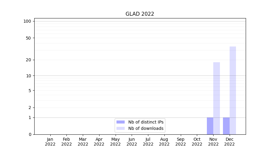 Number of downloads for annotation package GLAD, year by year, from 2025 back to 2014 (years with no downloads are omitted):