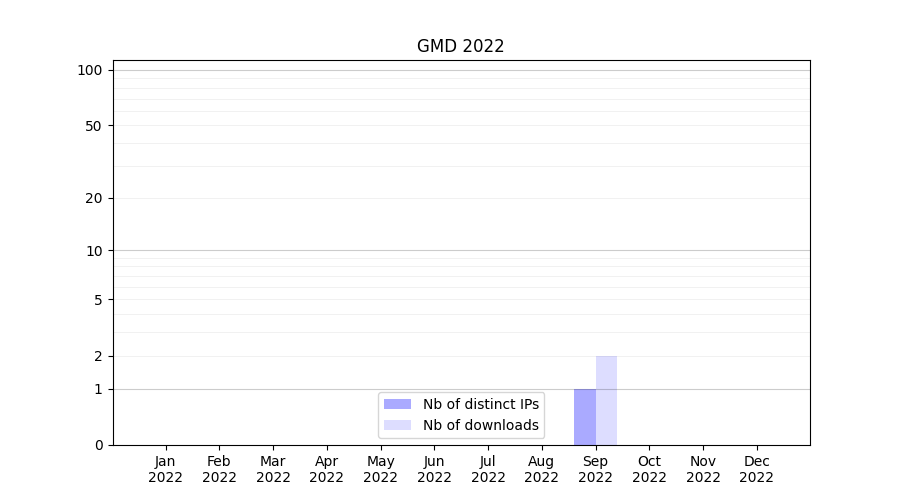 Number of downloads for annotation package GMD, year by year, from 2025 back to 2014 (years with no downloads are omitted):