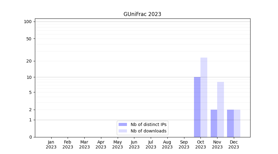 Number of downloads for annotation package GUniFrac, year by year, from 2025 back to 2014 (years with no downloads are omitted):