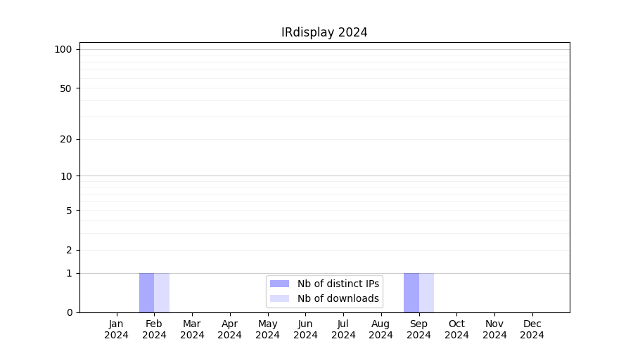 Number of downloads for annotation package IRdisplay, year by year, from 2025 back to 2014 (years with no downloads are omitted):