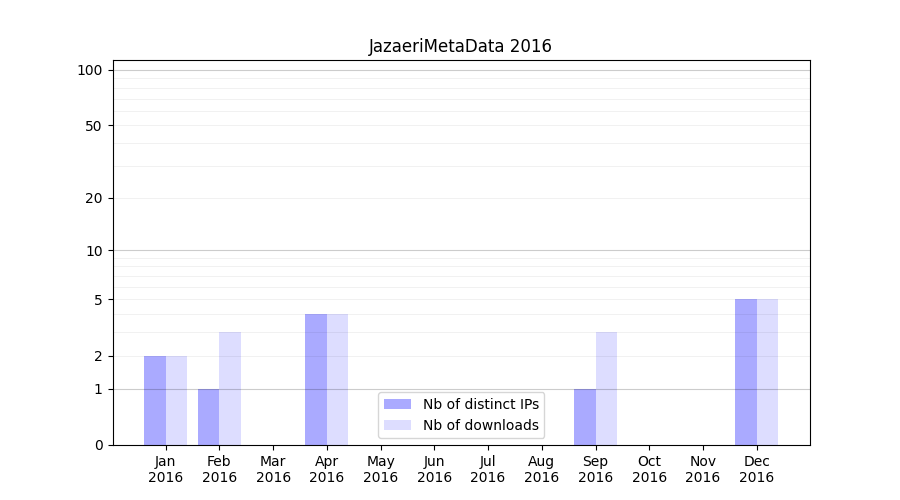 Number of downloads for annotation package JazaeriMetaData, year by year, from 2025 back to 2014 (years with no downloads are omitted):
