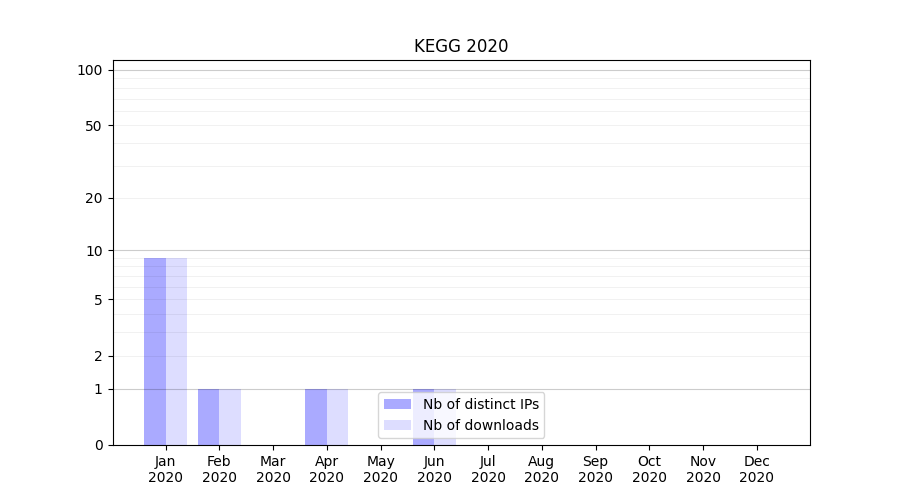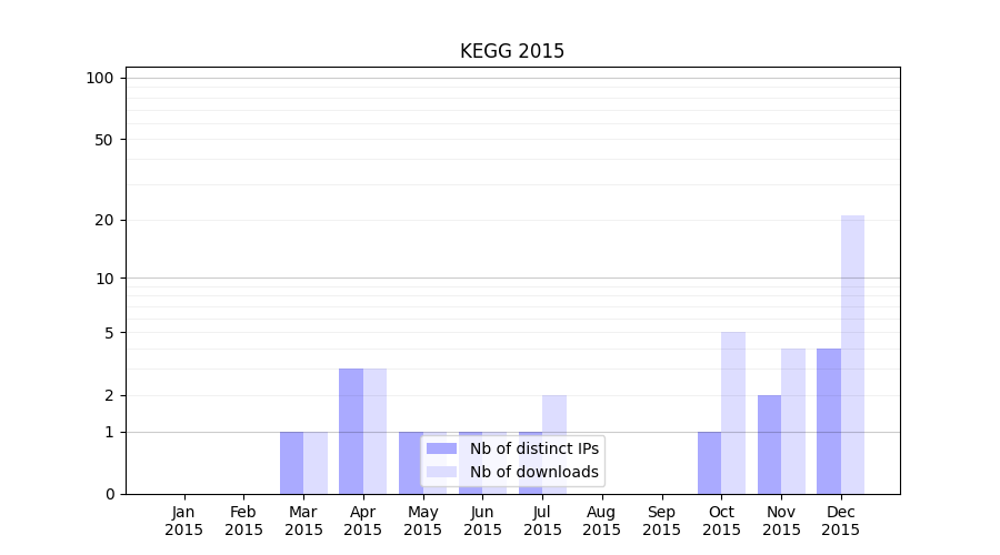 Number of downloads for annotation package KEGG, year by year, from 2025 back to 2014 (years with no downloads are omitted):