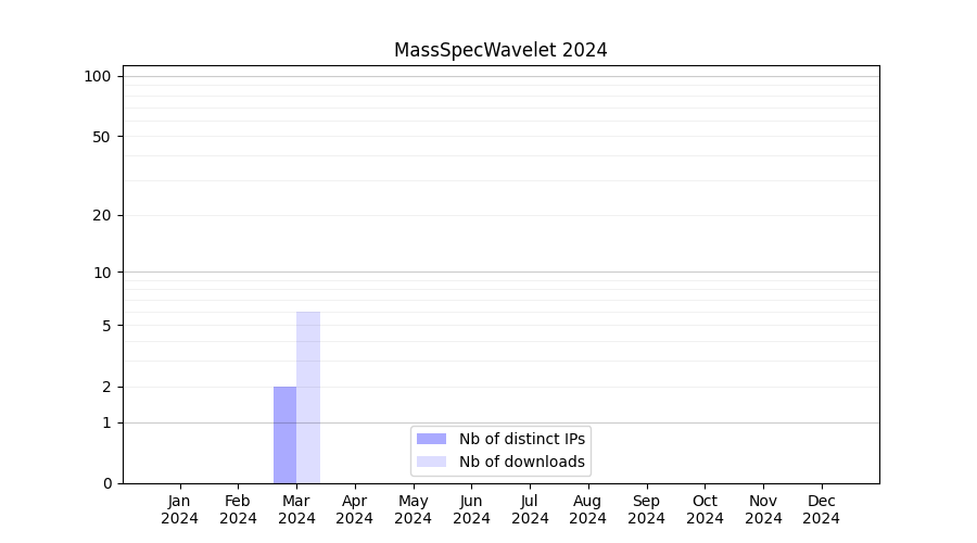 Number of downloads for annotation package MassSpecWavelet, year by year, from 2025 back to 2014 (years with no downloads are omitted):