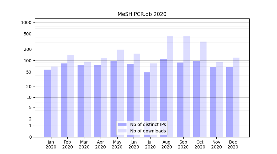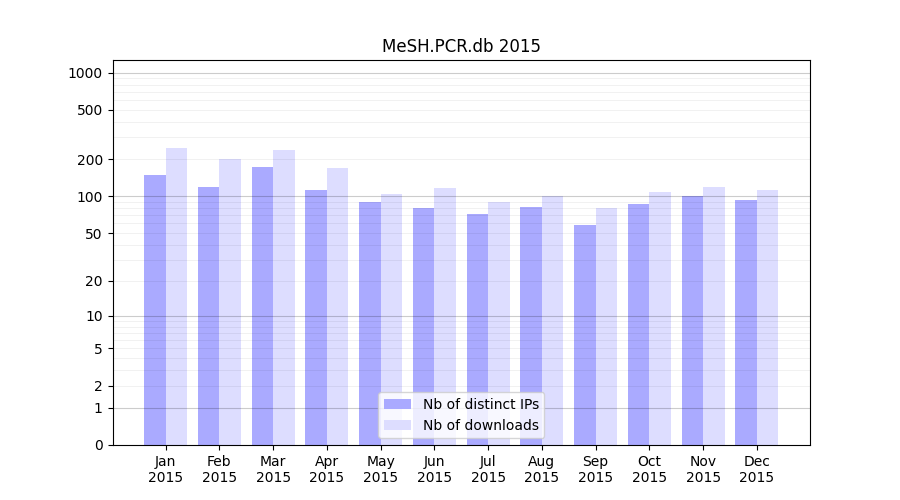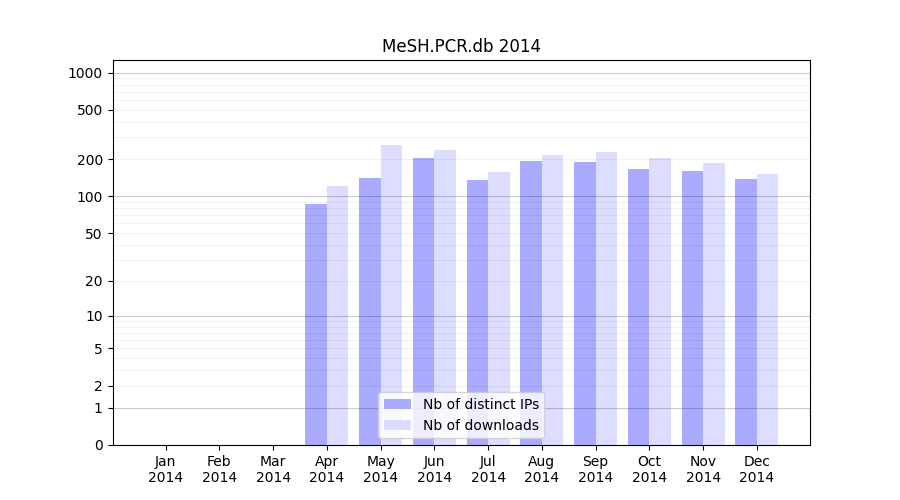 Number of downloads for annotation package MeSH.PCR.db, year by year, from 2025 back to 2014 (years with no downloads are omitted):