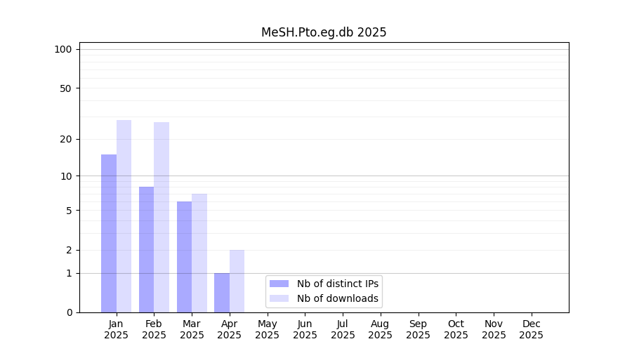 Number of downloads for annotation package MeSH.Pto.eg.db, year by year, from 2025 back to 2014 (years with no downloads are omitted):