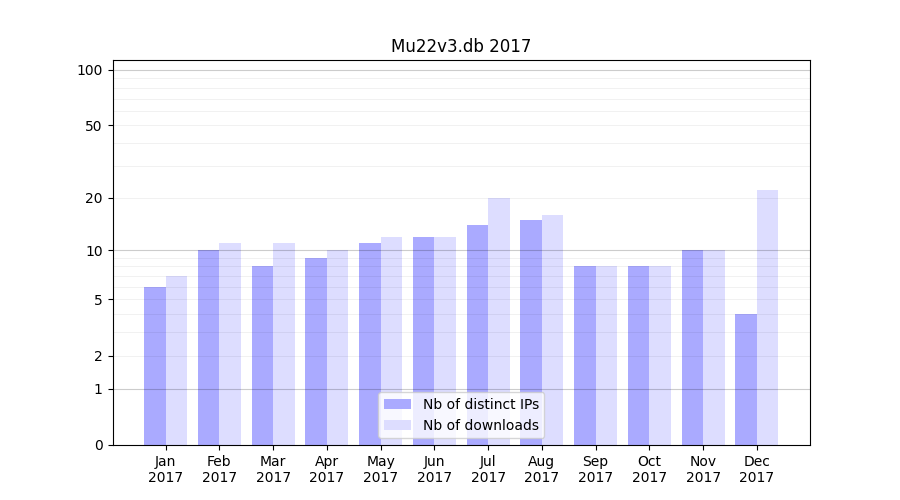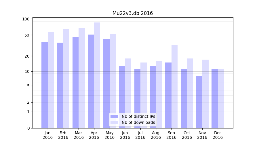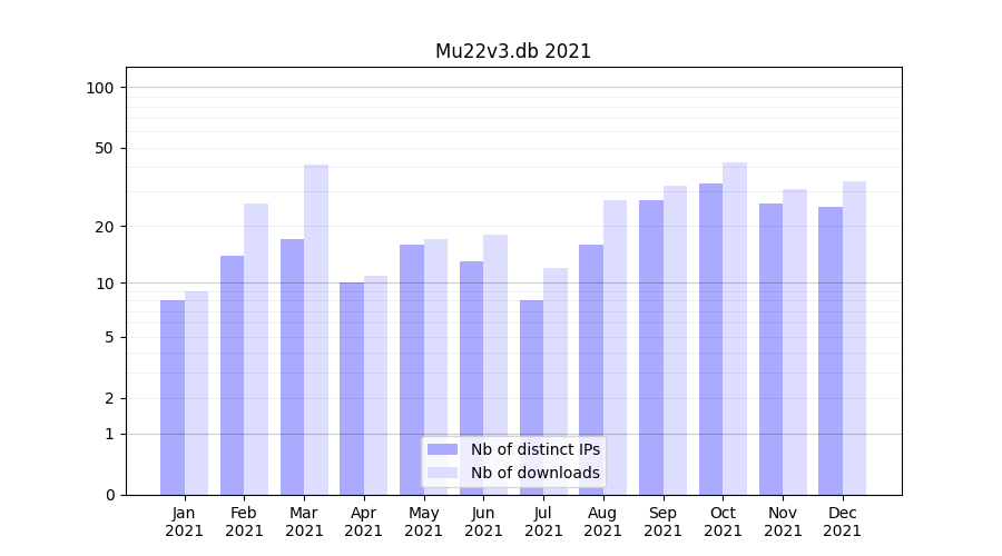 Number of downloads for annotation package Mu22v3.db, year by year, from 2025 back to 2014 (years with no downloads are omitted):