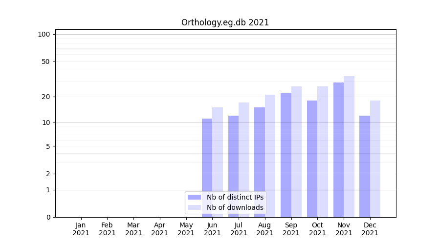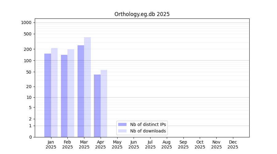 Number of downloads for annotation package Orthology.eg.db, year by year, from 2025 back to 2014 (years with no downloads are omitted):