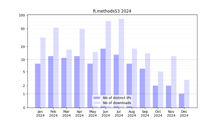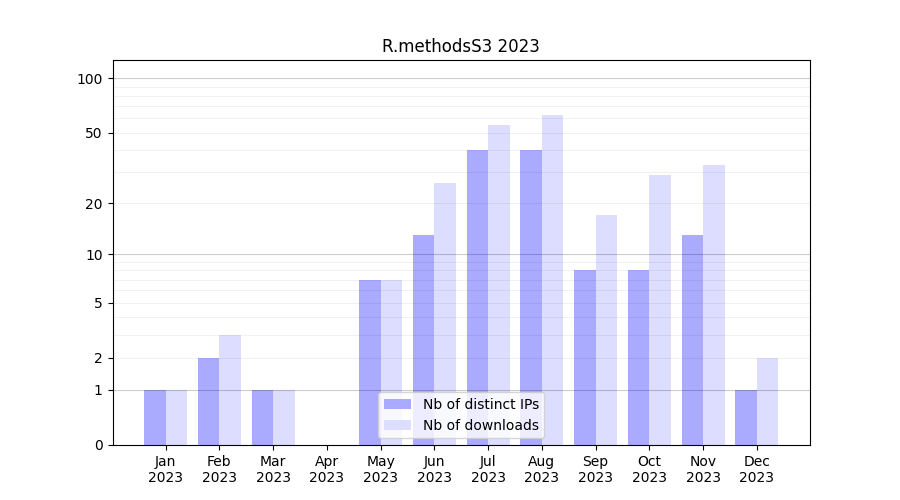 Number of downloads for annotation package R.methodsS3, year by year, from 2025 back to 2014 (years with no downloads are omitted):