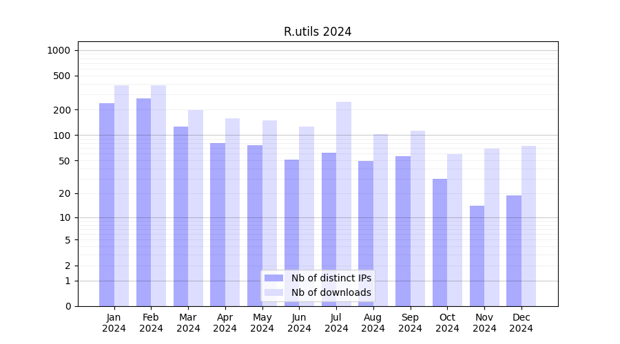 Number of downloads for annotation package R.utils, year by year, from 2025 back to 2014 (years with no downloads are omitted):