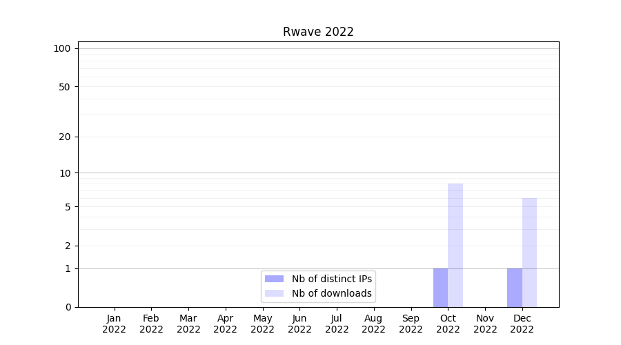 Number of downloads for annotation package Rwave, year by year, from 2025 back to 2014 (years with no downloads are omitted):
