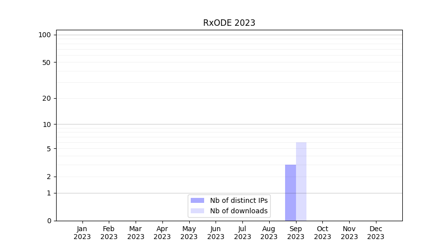 Number of downloads for annotation package RxODE, year by year, from 2025 back to 2014 (years with no downloads are omitted):