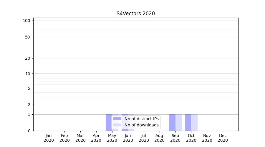 Number of downloads for annotation package S4Vectors, year by year, from 2025 back to 2014 (years with no downloads are omitted):
