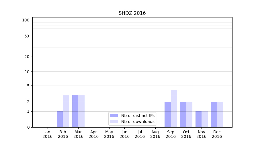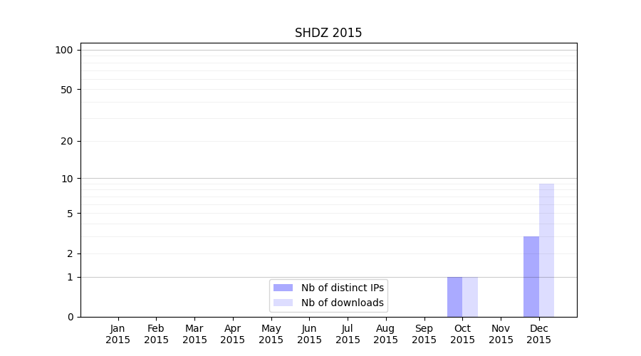 Number of downloads for annotation package SHDZ, year by year, from 2025 back to 2014 (years with no downloads are omitted):