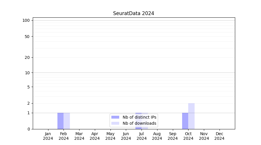 Number of downloads for annotation package SeuratData, year by year, from 2025 back to 2014 (years with no downloads are omitted):